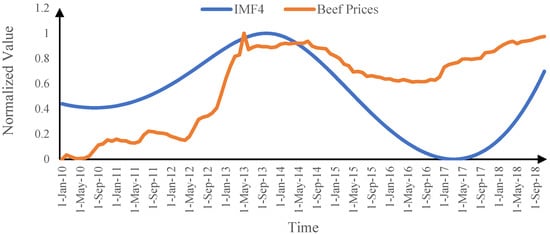 From Figure 8, it is easy to see that IMF4 and beef prices have a relatively similar fluctuation trend on the whole. From the analysis of the peak and valley changes of the two variables, it was found that the overall fluctuation trend of the two variables was the same. Therefore, from the trend chart of IMF4 and beef price, the beef price of substitutes has a positive impact on mutton price in the Xinjiang region of China.