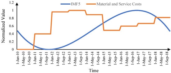 From Figure 9, the overall material and service costs showed a fluctuating trend of first rising, then falling and then rising, and finally reaching the peak from January to December 2013. Similarly, the fluctuation trend of IMF5 first decreases, then increases and then decreases. While the selected long-term factors have advantages in obtaining strong fluctuation signals, IMF5 is a low-frequency component, so the interpretation ability of low-frequency, moderate fluctuation signals is limited. Therefore, Figure 6 cannot reflect the impact of material and service costs on IMF5.