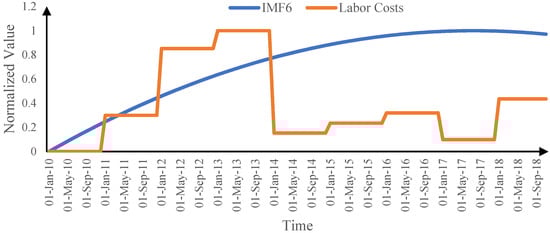 Similar to IMF5, the labor cost as a whole showed a fluctuating trend of first rising, then falling, and then rising slightly, and reaching the peak from January to November 2013 from Figure 10. Since IMF6 is the residual after decomposition, it shows an upward fluctuation trend on the whole. Therefore, the interpretation ability of the selected long-term factor for the low-frequency moderate fluctuation signal was limited, so that Figure 10 cannot reflect the impact of labor cost on IMF6.