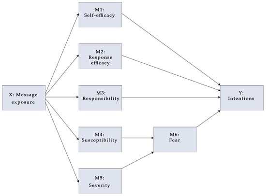 We used IBM SPSS Statistics to run all statistical tests. After assessing normality and analyzing data assumptions, we ran a one-way analysis of variance (ANOVA) test to analyze main effects. Then, PROCESS model 21 [57] was used to estimate two parallel-serial mediation models to test message direct and indirect effects (see Figure 1). The independent variable for each of the models was message exposure, entered as a multi-categorical predictor with indicator coding to compare each experimental condition to the control group. The dependent variable was pro-environmental behavior intentions for the first model and river cleanup behavior intentions for the second model. Model inferences were made using the bootstrapping method, taking 10,000 re-samples from the original data to construct 95% bias-corrected confidence intervals.