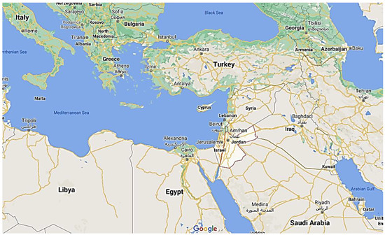 Figure 1 shows the location of Jordan, which is between the eastern Mediterranean from the north and west sides and the Arabian Desert from the south and east sides. This location can help in explaining its climatic conditions. It typically experiences long, hot, and dry summers that extend from June to September, with an average temperature between 20 °C and 35 °C. The lowest and highest monthly outdoor temperatures are highly variable in this climate throughout the year. Jordan has short and cold winters, from December until February, with a mean temperature of 4 °C to 11 °C. The temperature increases during the summer daytime to reach around 42 °C, especially when there is a dry, hot south-eastern wind. The precipitation mainly occurs in the winter and ranges between 250 and 450 mm, while in summer, it decreases or stops totally.