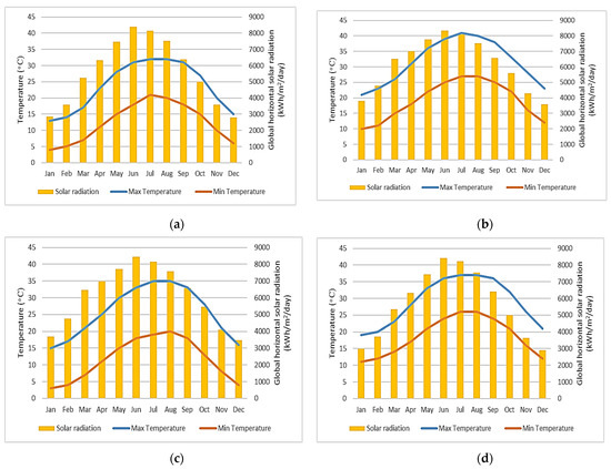 Average maximum and minimum temperatures and solar radiation profile for each climate zone. (a) Climate Zone 1; (b) Climate Zone 2; (c) Climate Zone 3; (d) Climate Zone 4.
