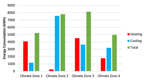 Figure 5 presents the energy required to maintain heating and cooling using air-conditioning so that it remains within constant temperature limits (18 °C and 24 °C) in various climatic zones. The annual energy consumption for heating and cooling in climate zones one, two, three, and four was 5226, 7791, 8136, and 4965 kWh, respectively. The heating demand was high in climate zones one and three but decreased in climate region four and was almost non-existent in climate zone two. The cooling consumption was significant in climate zone two and to a lesser extent in climate zones four and three, respectively. Although climate zone one had the lowest cooling demand, the amount of cooling required was still notable.
