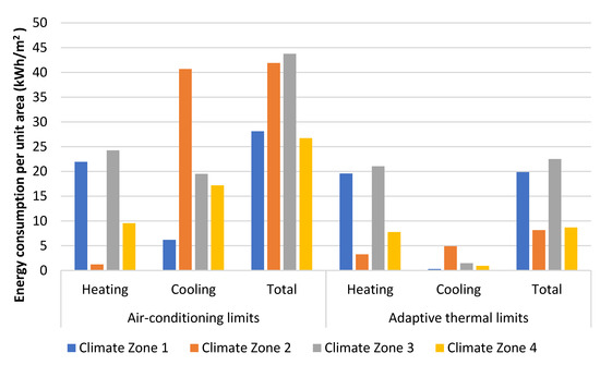 Figure 7 presents the energy required for heating and cooling per unit of the area using fixed sets of operative temperatures for air-conditioning and the adaptive comfort operative temperature limits.