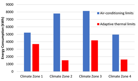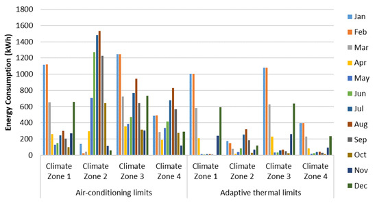 In the winter months, the adaptive thermal model reduces the heating demand slightly as opposed to the fixed temperatures of the air-conditioning unit. This is owing to the lower adaptive thermal comfort limits of 18.2 °C, 18.4 °C, and 18.1 °C in climate zones one, three, and four, respectively, compared with 19 °C for the fixed air-conditioning system. An exception to this is the second climatic zone, where a rise in heating demand was observed when using the adaptive thermal model where the lower limit is 20.6 °C. Operating the air conditioners using the acceptable temperature limits of the adaptive thermal model decreased the total energy usage for mechanical heating and cooling from 5226, 7791, 8136, and 4965 kWh per year to 3693, 1515, 4185, and 1612 kWh per year for climates zone one, two, three, and four, respectively, as illustrated in Figure 8 and Figure 9.