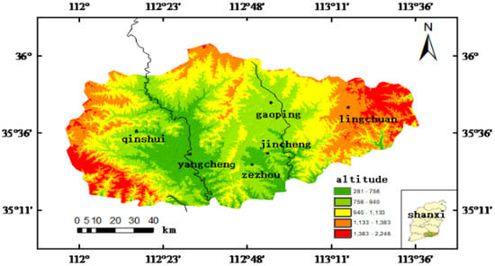 The southern part of Shanxi in this study area is situated in North China and the southern end of the Loess Plateau. The climate has four distinct seasons and belongs to the mid-latitude region of the temperate zone. Data were collected from six state-controlled environmental monitoring stations in Jincheng of southern Shanxi Province (Technical College, Municipal Environmental Protection Bureau, Baiyun Commerce and Trade, Water Supply Company, and Zezhou No. 1 Middle School) and 10 general monitoring stations in the following counties or cities: Qinshui County (County Culture Bureau and County Environmental Protection Bureau), Yangcheng County (Experimental Primary School and County Environmental Protection Bureau), Lingchuan County (Nanguan primary School and Experimental Primary School), Zezhou County (Danhe Wetland and Technical Secondary School), and Gaoping (Gaoping No. 1 Middle School and Dongfanghong Primary School) (Figure 1). The pollutants monitored included SO2, NO2, CO, O3, PM2.5, and PM10. The air quality index (AQI) refers to the expression of air pollution degree and air quality. The meteorological field data were collected from the Global Data Assimilation System data provided by NCEP for the winter of 2018 to 2020, four times a day, i.e., 12:00 a.m., 6:00 a.m., 12:00 p.m., and 6:00 p.m. (UTC), with a horizontal resolution of 1° × 1°. These data included the wind speed and direction data of winter for all grades from 2018 to 2020.