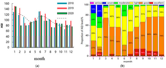 Monthly change in AQI from 2018 to 2020 (a) and monthly proportion of different AQI (b). The blue dotted line represents the 2 year average.