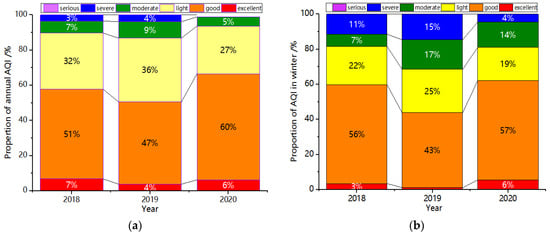 Proportion of annual AQI level (a) and winter AQI level (b) from 2018 to 2020.