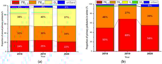 The primary pollutants throughout the year were atmospheric particulate pollutants PM10 and PM2.5, accounting for 55–56% from 2018 to 2020, with little change year by year. In addition, the number of days in which O3 was the primary pollutant accounted for about 40%, with other pollutants accounting for less. The overall change differed by year. PM2.5 was the primary pollutant, reaching 50–69%, while PM10 reached 27–46%. The number of days with particulate matter as the primary pollutant in winter increased significantly, nearly double that of the whole year, mainly because of the weaker O3 pollution in winter.
