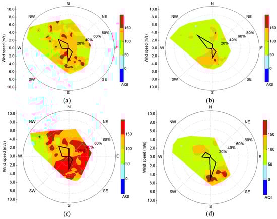 Windrose with AQI concentrations in Jincheng: (a) winter; (b) December; (c) November; (d) February. The percentage values represent the proportion from the center point with wind speed of 0. The black delineated area represents the dominant wind direction, wind speed, and wind frequency.