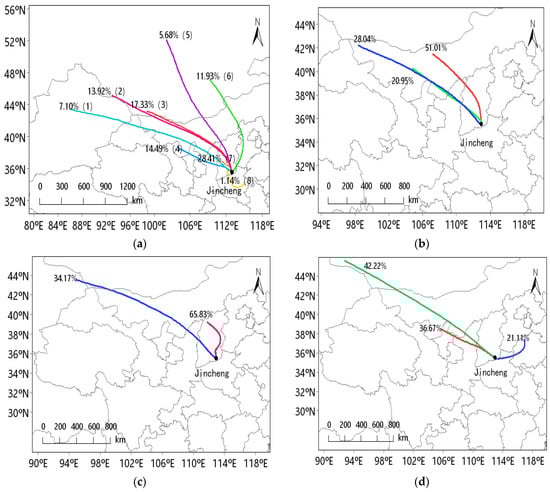 Using the backward trajectory calculation method and clustering method provided by trajstat software, the trajectory calculation was carried out on the AQI data of Jincheng (35.53° N, 112.52° E) from 2018 to 2020, and the pollutant transportation trajectories of Jincheng in winter and each month (December and January and February of the next year) were obtained (Figure 7). It can be seen from Figure 7a that there were eight transmission trajectories and five northwest trajectories in winter (categories 1, 2, 3, 4, and 7) accounting for 52.84%, two northerly trajectories accounting for 17.61% (categories 5 and 6), and a southeast trajectory accounting for 1.14% (category 8). Figure 7b–d show the trajectory results of each month in December, revealing three main trajectories in the northwest direction in Inner Mongolia. In January, the two trajectories were in the north and northwest directions respectively, accounting for 65.83% in west Inner Mongolia and at the junction of Xinjiang and Mongolia. In February, the three trajectories in the northwest direction accounted for 42.22% in Mongolia, 36.67% in Yan’an in Yulin and Ningxia in Shanxi, and 21.11% in Xinxiang and Hebi in Henan.