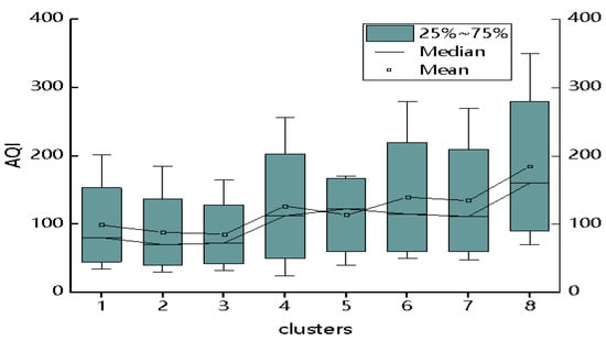 Figure 8 shows the box diagram of AQI distribution of eight trajectories in winter in Jincheng. The average AQI of the eight trajectories was 68.8–149.6, with a minimum of 25 and a maximum of 350. The magnitude of the AQI variation of the type 3 trajectory was the smallest, 32–165, while that of the type 8 trajectory was the largest, 70–350.