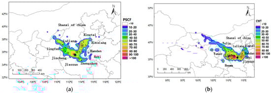 Analysis of winter PSCF (a) and CWT (b) in Jincheng from 2018 to 2020.