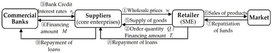 Assume a simple supply chain consisting of a supplier and multiple retailers, where the supplier is a core firm, the retailers are all SMEs, and multiple retailers order goods from the core firm at the same time. Assume that both the supplier and the retailer are financially constrained in their trading process, and are unable to produce and sell independently [33]. For suppliers located in the core enterprises with high profitability and corporate reputation, commercial banks can provide loans directly to them, while retailers who are SMEs cannot obtain financing directly from banks due to their own limitations, so they can consider applying for trade credit financing from the core enterprises in the supply chain to obtain financial support. At the beginning of the sales period, subject to funding constraints, retailer applies for trade credit financing from a supplier at an interest rate of . After the supplier has determined the wholesale price , retailer determines the order quantity and the financing amount . Similarly, a financially constrained supplier receives an order from a retailer and signs a loan agreement to obtain financing through a commercial bank in the amount of where C represents the supplier’s marginal cost of production and r represents the bank loan rate. It is assumed that the supplier is sufficiently rational such that . The supplier receives the funding, organizes production and dispatches the product, which the retailer sells in the retail market at market price M. At the end of the sales period, all of the funds owned by the retailers flow back and repay the trade credit facility debt to the suppliers, who repay the bank credit facility debt. If market conditions are good and all retailers have sufficient funds to repay the principal and interest on the trade credit facility provided by the supplier, then the supplier will also be able to repay the bank credit facility as promised and neither the retailer nor the supplier will be in default at that point. If market conditions are poor and a proportion of retailers is unable to repay their supplier debts on time, this will, to some extent, result in the supplier being unable to repay the commercial bank facility, at which point the credit risk of that proportion of retailers is transmitted to the supplier. If market conditions are adverse and the closing capital flows of all retailers are not sufficient to repay supplier debts, i.e., all retailers default on trade credit, the supplier suffers severe losses and its recoveries are highly unlikely to be sufficient to cover the bank credit, at which point the supplier defaults and there is credit default risk contagion in the supply chain. Therefore, the supply chain decision-making process under the single-channel credit model is shown in Figure 1.