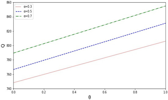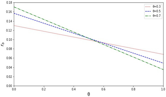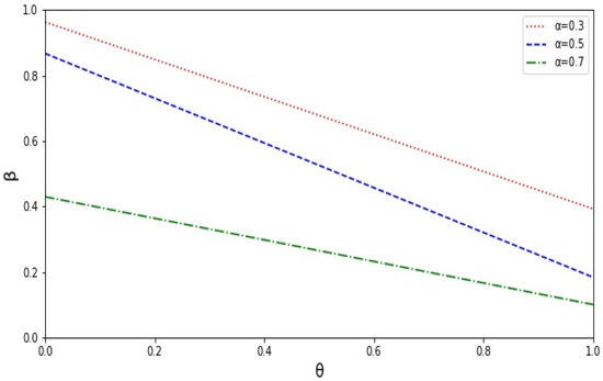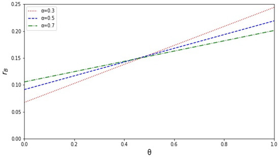 Figure 11 shows that there is a negative correlation between the retailer’s repayment priority on the supplier’s trade credit debt and the supplier’s bank credit rate . As the retailer’s repayment priority on trade credit debt gradually increases, the supplier’s bank credit rate decreases. This suggests that the greater the probability that a retailer will prioritize repayment of the supplier’s trade credit debt, the lower the probability that the supplier will be exposed to the retailer’s trade credit default risk at the end of the sales period. Commercial banks are less likely to face a loss of funds and in turn consider reducing the cost of supplier bank credit by lowering the supplier’s credit rate. Conversely, where the probability of the retailer repaying the supplier’s trade credit debt on a priority basis is low, the retailer considers repaying the commercial bank’s debt on a priority basis, when the supplier faces a higher risk of the retailer defaulting on its trade credit. In this case, the commercial bank will consider increasing the supplier’s bank credit rate to reduce its own potential risk of loss. A comparative analysis was conducted of the change in the supplier’s bank credit rate when the retailer’s bank credit ratio was , and , respectively. According to Figure 11, as the retailer’s repayment priority gradually increases, the retailer’s bank credit ratio decreases. When the retailer’s bank credit limit is low, the supplier’s bank credit rate decreases more slowly. When the retailer’s bank credit is larger, the supplier’s bank credit rate decreases more quickly. At a lower repayment priority of the retailer, the higher the retailer’s bank credit ratio , the higher the bank credit rate faced by the supplier, and the lower the retailer’s bank credit ratio , the lower the bank credit rate faced by the supplier. When the retailer’s repayment priority is higher, the higher the retailer’s bank credit ratio and the lower the supplier’s bank credit rate . This phenomenon is mainly due to the fact that commercial banks derive their revenue from the retailer’s bank credit and the supplier’s bank credit, respectively. When the retailer’s repayment priority is lower, the retailer has a higher probability of repaying the bank credit debt first, the commercial bank faces less risk of default on the retailer’s credit, and the commercial bank gains relatively less benefit from the retailer’s bank credit being smaller. Thus, the commercial bank offers a lower bank credit rate to the supplier to enhance its own benefit. When a retailer has a higher probability of repaying the supplier’s debt first, the commercial bank is exposed to the risk of default by the retailer, and when the retailer’s bank credit line is larger, the commercial bank is exposed to a higher risk of default. Therefore, in order to ensure the sustainability of the supply chain, the commercial bank mitigates its risk by offering a lower interest rate on the supplier’s loan.