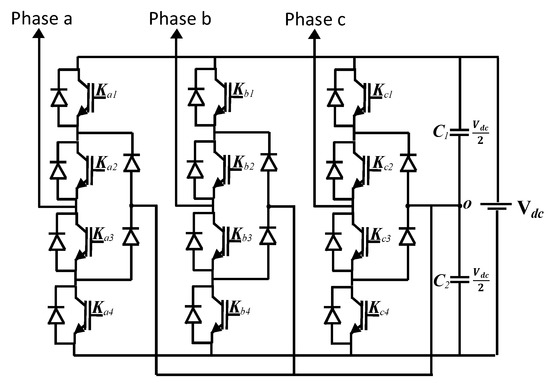 The circuit diagram of the three-phase 3L-NPC inverter, also called the B12 inverter, is presented in Figure 1. It is composed of three legs. Each one includes two pairs of series-connected insulated gate bipolar transistor (IGBT) power switches (upper and lower), noted where p refers to the stator a–b–c phases and i (i integer with ) refers to the switch number, in parallel with four freewheel diodes. It also includes two clamping diodes per leg, enabling the clamp of the DC voltage at three desired levels per phase: , 0, . Referring to Figure 1, one can notice that the DC voltage is split into two equal levels using two series-connected capacitors, and , with a middle point in between, the so-called “neutral point”. In each leg, the state of the first and the third switches are controlled complementary. For instance, if the switch is in the ON state (binary “1”), its complement is in the OFF state (binary “0”), and inversely. The same rule is applied for the pair of switches and .