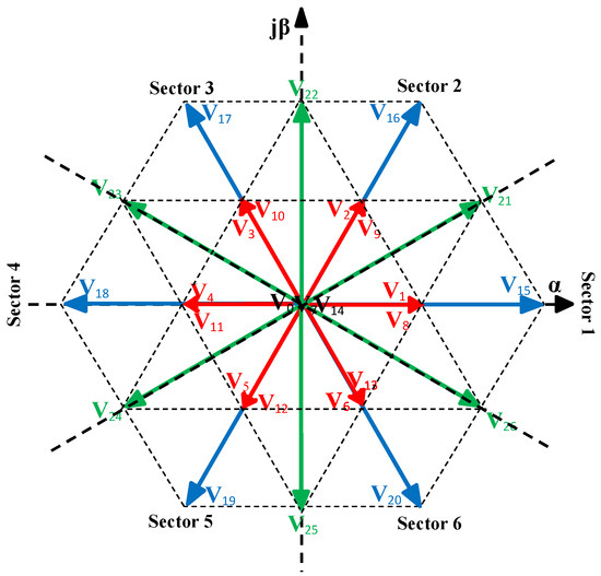 Accounting for the possible combinations of the states of the power switches of the three legs, the 3L-NPC inverter can generate 27 voltage vectors, as shown in Figure 2.