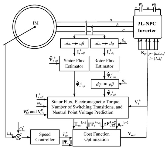 The control of output features is achieved using the electric machine model in order to formulate the so-called cost function. However, a major problem of MPC schemes is the weighting factors involved in the cost functions; the drive performances are directly allied to their suitable online adjustments [20]. To date, there is a lack of theoretical support dedicated to the assessment of weighting factors. This makes their online adjustments time-consuming procedures, especially when the number of involved voltage vectors is high, such as in the case of three-level inverters. The latter requires a specific criterion while designing the cost functions of MPC strategies, which is the neutral point voltage balance [21,22,23].