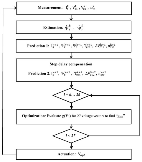 Another class of MPC strategies, characterized by cost functions independent of the stator flux weighting factor, was also implemented in 3L-NPC inverter-fed IM drives. In [30], Xiao et al. proposed a predictive flux and neutral-point voltage control scheme for a 3L-NPC inverter-fed IM drive. The proposed strategy considered a cascaded structure of predictive control with the stator flux predicted and evaluated using 13 switching states in the maximum, and the neutral-point voltage predicted and minimized for two switching states, according to a predefined limit. In [31], Xiao et al. introduced another cascaded predictive control scheme involving three separate cost functions aimed at a sequential control of the stator flux, the neutral point voltage, and the inverter switching loss. In [32], Osman et al. developed a predictive flux control strategy based on the prediction of the reference stator flux vector. In the first stage, the evaluation of the six long voltage vectors was carried out. The optimal long vector enabled the definition of an optimal hexagon containing 11 medium and short voltage vectors, resulting in a reduction of admissible voltage vectors to 17 among the 27 permissible ones.