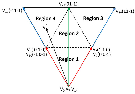 In this case, the approximation of the reference voltage vector is achieved by applying dedicated voltage vectors, according to the location of the extremity of , as follows:
