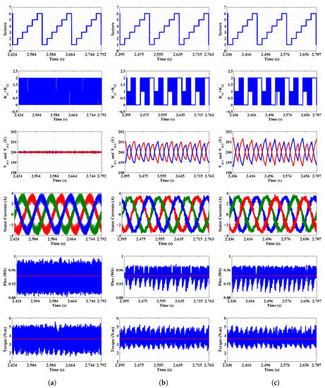 - Figure 9d–f show the scopes illustrating the waveforms of the stator flux and the electromagnetic torque yielded by C-PTC, SV-PTC1, and SV-PTC2, respectively,
