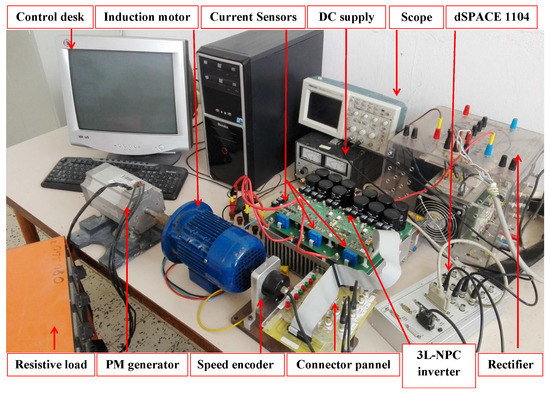 For the sake of the experimental validation of the simulation results, a test bench was built around a 3L-NPC inverter-fed IM drive, as shown in Figure 8. Manufactured by SEMIKRON, the 3L-NPC inverter was equipped with three current sensors at its output, and two voltage sensors enabled the measurement of the voltages across the DC bus capacitors in its input. The latter was made up of the parallel connection of six equal capacitors of 610 F, yielding a total of 3660 F per DC bus capacitor. A SEMIKRON full bridge diode rectifier fed the 3L-NPC inverter with a constant DC voltage of 400 V. The IM had the same ratings and parameters as the machine considered in the simulation. It was mechanically-coupled to a brushless DC generator whose armature was connected to a variable three-phase resistor. The mechanical sensor mounted on the IM second shaft terminal was a rotary incremental optical encoder HEIDENHAIN ROD 420D yielding 1024 pulses per revolution. The used digital control platform was a dSPACE-1104 linked to a desk computer through a PCI connector. The developed PTC strategies were implemented using a Matlab–Simulink software package.