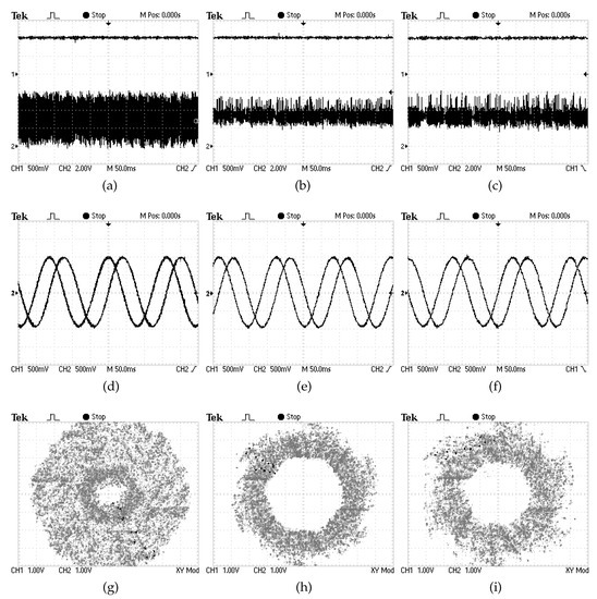 Experimental characterization of the steady-state operation of the 3L-NPV inverter-fed IM drive at a speed of 190 rpm and a load torque of 3.56 N·m. Legend 1: (C-PTC) left scopes, (SV-PTC1) middle scopes, (SV-PTC2) right scopes. Legend 2: (a–c) the stator flux (0.5 Wb/div) and the electromagnetic torque in the bottom (2 N·m/div), (d–f): the - and the -components of the stator flux (0.5 Wb/div), (g–i): the locus described by the extremities of the stator current vectors in the -plane (1 A/div).