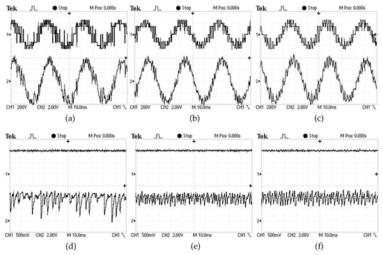 - Figure 10d–f show the scopes illustrating the waveforms of the two DC bus capacitor voltages and yielded by C-PTC, SV-PTC1, and SV-PTC2, respectively.