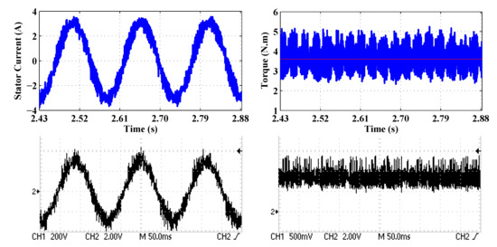 In order to characterize the degree of agreement between the simulation and experimental results, a simulation was carried out at a steady-state operation under the same experimental conditions of Figure 10 and Figure 11, with emphasis on the stator current and the electromagnetic torque waveforms. In order to amplify the waveforms making clear the differences between the simulation and experimental results, the investigation has been limited to a single strategy: SV-PTC1 for instance. The obtained results are shown in Figure 13. For the sake of comparison, the experimental waveform of the stator current shown in Figure 10 and one of the electromagnetic torques depicted in Figure 11, are recalled. One can notice that both simulated and measured stator phase currents are slightly distorted sharing almost the same peak-to-peak value of 6 A. Concerning the electromagnetic torque, the simulated waveform has a ripple of 2.57 N·m, while the one yielded by the experimental tests was 2.60 N·m. This comparison proved the acceptable agreement between simulation and experimental results.