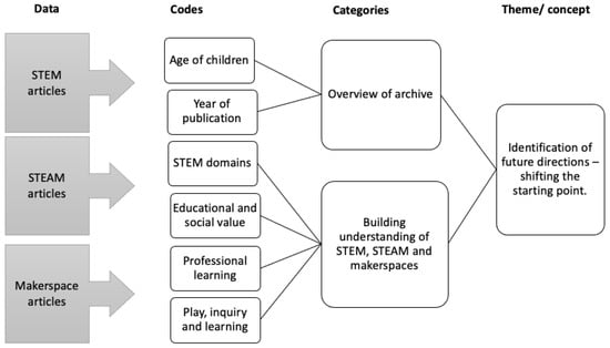 Once charted, the data were reviewed again to collate the identified codes into broader overarching categories. Following the Arksey and O’Malley [25], a numerical summary and analysis of themes was then undertaken. Numerical tables were developed to map the prevalence of key codes of the review across the three focus areas of STEM, STEAM and makerspaces, following Saldaña’s [26] code to theory approach. In this approach codes are identified from the data, collated into categories, and then further refined to develop an overarching theme (See Figure 1).