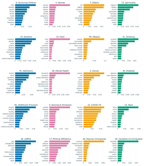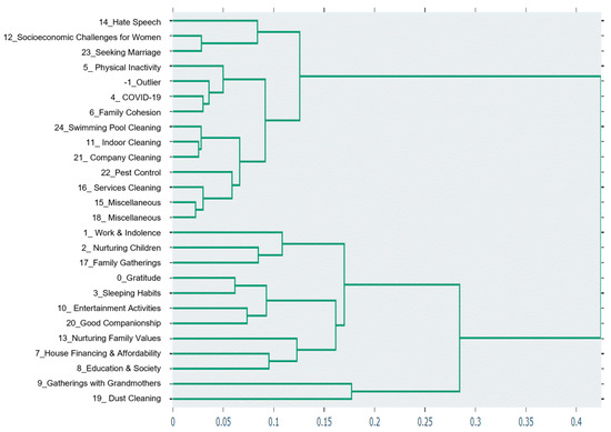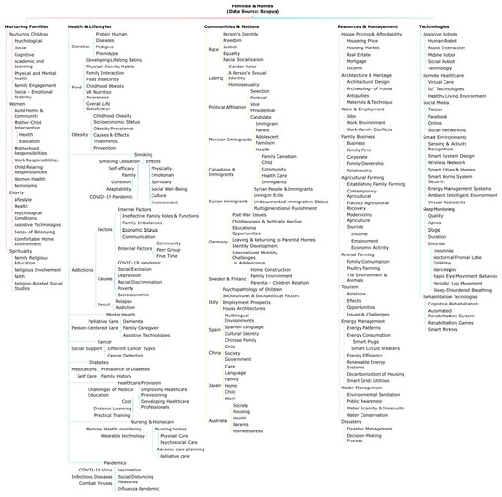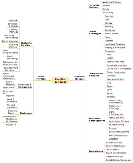 Figure 1 shows a multi-perspective (academic and public) view of families and homes comprising social, political, economic, environmental, and other issues discovered using Scopus and Twitter data. The figure exhibits the macro-parameters and parameters, laid out at the first branch level and the second branch level, respectively. The figure shows that the parameters discovered from the Scopus dataset provide a fairly comprehensive academic view of families & homes. The learned parameters capture and bring together, structurally, such wide-ranging issues including, among others, family roles and issues surrounding children, women and the elderly; specific physical and psychological diseases; addictions; house pricing and affordability; architecture and heritage; work and employment; family businesses; farming; animal farms; tourism; energy management; water management; pandemics and disasters; technologies for remote, rehabilitation, and wearable-based healthcare and assistive robots; and issues specific to various political affiliations, races, communities, and nations from Canada, Europe, Asia, and America. The parameters detected by the Twitter data show a very local and public Saudi view of families with parameters such as an emphasis on nurturing family values; family cohesion; good companionship; gatherings with grandmothers; house financing and affordability; work and indolence; sleeping habits; and socioeconomic challenges for women. None of the earlier works have provided such an extensive view of families and homes captured systematically from academic and public perspectives. These could be used by, for instance, academia, to focus on problems that are more important for public and specific cultures, communities, and societies.