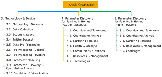 The remainder of the paper is organized as follows. Section 2 discusses the works relevant to this paper and identifies the research gap. Section 3 describes the methodology of this work, which includes determining parameters for families and homes using Scopus and Twitter data, as well as the design of our tool. Section 4 explains and analyzes the parameters discovered from Scopus data, offering an academic perspective on families and homes. Section 5 expands on the parameters discovered from Twitter data that provide a public view of families and homes. Section 6 contains a discussion, and Section 7 concludes with recommendations for future work. Figure 2 shows the map of Section 3, Section 4 and Section 5 to help the reader navigate through the article.