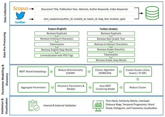 This section explains the methodology and design of the proposed system architecture. Our software architecture is outlined in Figure 3, which consists of four software components that will be discussed in the following sections. Section 3.1 discusses the methodology overview, including the master algorithm. Section 3.2, Section 3.3, Section 3.4, Section 3.5, Section 3.6, Section 3.7, Section 3.8, Section 3.9 and Section 3.10 explain data collection, the data sources we used in this research (Scopus and Twitter), pre-processing, parameter modelling, parameter discovery & quantitate analysis, validation, and visualization, respectively.