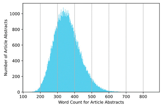 Figure 4 shows the histogram for the article abstracts. In this graph, the x-axis provides the word count of the articles in the dataset and the y-axis provides the number of articles in the dataset for a given number of words. Most article abstracts were between 300 and 400 words long. There were a few abstracts that were longer than 600 words.