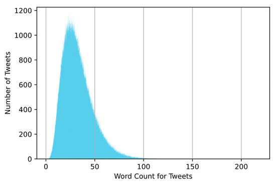 Figure 5 provides a histogram of the tweets in the dataset. The x-axis shows the number of tweets, and the y-axis shows the number of words in the tweets. The majority of tweets are approximately 20 to 50 words long. There are relatively few tweets that contain more than 75 words. The maximum number of words in a tweet are 120.