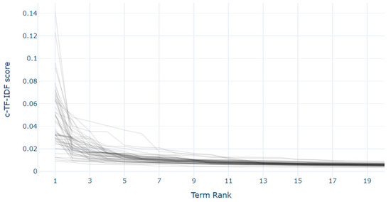 Additionally, the c-TF-IDF score (Class Based Term Frequency-Inverse Document Frequency) is used to calculate words’ importance for each document. The TF-IDF score (Term Frequency-Inverse Document Frequency) determines the frequency and prominence of a word in each document and evaluates the word relevance between documents. While the c-TF-IDF considers all the documents of a cluster as a single whole document and then executes the TF-IDF on it, it will achieve a significance score for each word inside a cluster called the c-TF–IDF score. Words that are most significant within a cluster represent that cluster most effectively. In this way, we were able to obtain keyword-based descriptions for every cluster, which helped to specify the parameter name for it. A c-TF-IDF score was calculated using Equation (1) [34], where f = the word frequency is derived for each class or cluster c and divided by the number of words w. The total number of un-joined documents (d) was then divided by the total frequency of words (f) throughout all classes (cc).