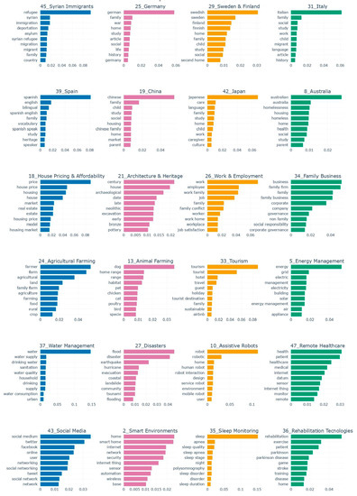 We implemented the proposed data-driven approach for families & homes into a software tool. The tool consists of four software components: data collection, pre-processing, parameter modelling & discovery, and validation & visualisation. The tool can discover parameters related to families and homes using the datasets described above. The two datasets were collected and pre-processed to generate data in a form that the machine learning processing engine was able to process. We used a pre-trained BERT word embedding model, Bidirectional Encoder Representations from Transformers [27]. Subsequently, the Uniform Manifold Approximation and Projection (UMAP) [28] algorithm was used as a method for reducing dimensions, and Hierarchical Density-based Spatial Clustering of Applications with Noise (HDBSCAN) [29] was applied as a clustering algorithm. Moreover, the class-based TF-IDF score (term frequency-inverse document frequency) was used to cluster documents automatically in datasets [30]. We extracted two taxonomies from academic and public perspectives on families and homes. A range of quantitative methods was then used to analyze each dataset in order to discover families and homes parameters and macro-parameters, including similarity metrics [31], hierarchical clustering [32], term score [33], keyword score [34], and an inter-topic distance map [35]. The datasets, document clusters, and parameters were explored using various visualization methods, such as histograms [36], taxonomies, similarity matrices, temporal progression plots, and word clouds.