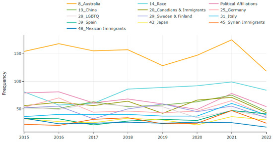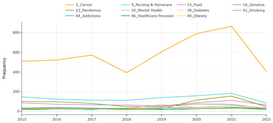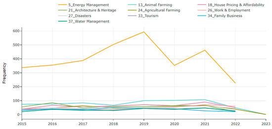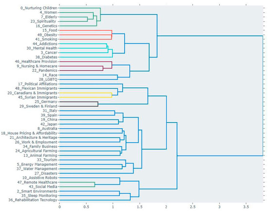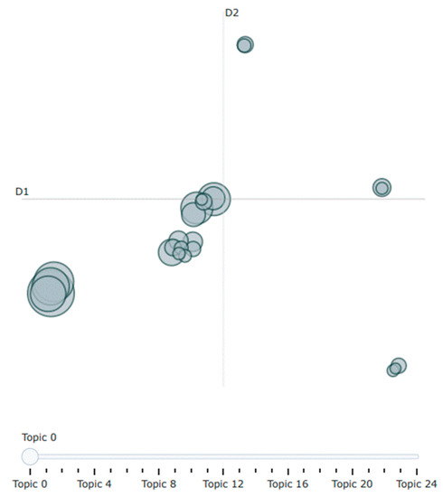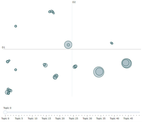 The inter-topic distance map represents the parameters in a two-dimensional way, represented by parameter circles whose size corresponds to the number of words used in the dictionary to describe that parameter. A MinMaxScaler algorithm is used to form the circles. The parameters closer together share more words [30].