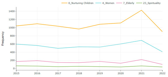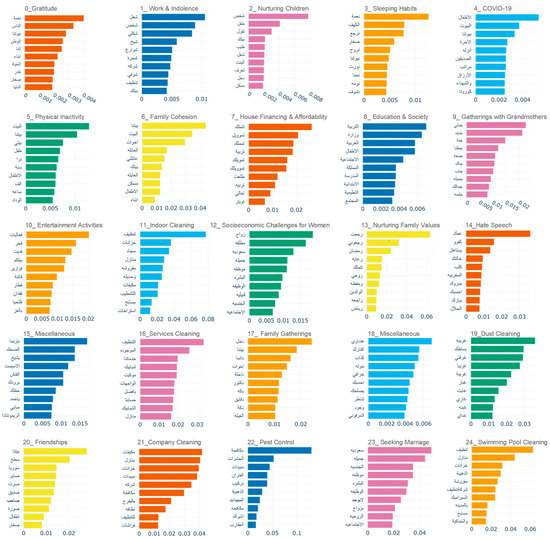 The power of Twitter as an information source cannot be overstated. Many studies have used Twitter data in their research. For instance, researchers have conducted a thematic analysis of Twitter data in various study domains. For example, Alotaibi [2] introduced Sehaa, an Arabic-language big data analytics tool for healthcare in Saudi Arabia. A big data tool developed over Apache Spark, called Iktishaf, was proposed by Alomari [43,44] for detecting traffic-related events in Saudi Arabia based on Twitter data. Saurs et al. [45] used data mining techniques to identify the main security concerns in smart living environments. Many research have done on discovering COVID-19 issues using Twitter data analytics [46,47]. For instance, Su et al. [48] used Twitter to investigate the spatial-temporal factors and socioeconomic disparities that shaped U.S. residents’ responses to COVID-19. An analysis of the sentiment and topics extracted from the COVID-19 tweets was conducted by Abdulaziz et al. [49]. Furthermore, Alswedani et al. [39] provided a comprehensive understanding of governance parameters related to the education sector using data-driven discovery tools developed for Twitter. Many other studies are available on the use of social media analytics on various topics [50,51,52,53,54]. However, as far as we know there is no study related to families & homes of a similar nature using Twitter data analytics in Arabic or in other languages.