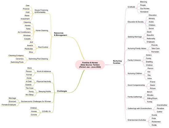 The Twitter dataset that provides a public view of families and homes was collected for a period of six months, January to June 2022. A total of 930,110 tweets were retrieved. The data was limited to Saudi Arabia because we aimed to understand local issues related to families and homes and compare them with the international academic perspectives. We discovered 22 parameters and grouped them into three macro-parameters namely, Nurturing Families, Resources & Management, and Challenges.