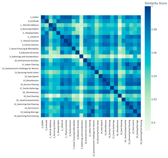BERTopic uses class-based TF-IDFs and BERT embeddings to create dense clusters. BerTopic supports a variety of modeling methods, including hierarchical, guided, semi-supervised, dynamic, and online methods. Many embedding models can be used with BERTopic, including Sentence-Transformers, Transformers, Flair, Spacy, Gensim, and USE. The sentence-Transformers model has shown great results in embedding documents with semantic similarity, so we use it here. Different visualization methods are supported, such as word scores, inter-topic distance map, hierarchical clusters, and similarity matrix, which help to understand the model and make changes as needed. BERTopic can extract the number of topics described in documents and does not require a prior definition of the number of topics. This is one of the advantages of BERTopic over the most popular topic modeling techniques such as Latent Dirichlet allocation (LDA) and Non-Negative Matrix Factorization (NMF). Further information can be found in these resources [27,30,64,65]: