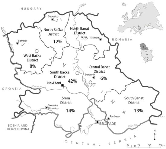 This research took place in the Autonomous Province of Vojvodina, a northern region in the Republic of Serbia. It is identified as significant by this research because it is the largest producer of agricultural and food products [56]. The research was conducted in catering facilities in this region. Three hundred respondents participated in the research; all of them were representatives of different catering facilities. The facilities were chosen through random sampling with the proportional deployment of the number of employees in catering facilities located in administrative parts, according to the list of the Republican Bureau of Statistics [57]. The deployment of sampled facilities shown on Figure 2 is the following: