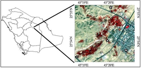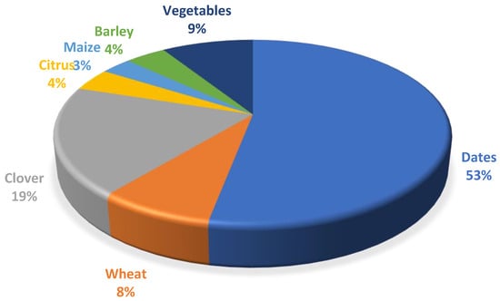 Al Majmaah city is located at 25°54′14″ N 45°20′44″ E in Riyad Province of SA (Figure 1). Al Majmaah has a total area of about 30,000 km2 and a population of 97,349. The geology of the study area is diverse, including sand, clay, and limestone [16]. The climate in the region is hot and dry, with chilly winters. The climatic parameter values for the Majmaah region for the year 2021 are shown in Table 1. The Majmaah region’s main crops are dates, clover, and wheat (Figure 2).