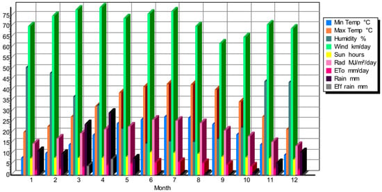 The monthly minimum and maximum temperature data in °C (Tmin, Tmax), humidity (%), wind (km/day), and rainfall dataset (in mm) of four AWS were collected from January 2018 to December 2021 (Figure 3). The sun hours data were collected from the National Renewable Energy Laboratory (NREL) website (https://www.nrel.gov/gis/solar-geospatial-data-tools.html; accessed on 10 June 2022). The high resolution of the AWS dataset’s temporal availability provides an opportunity to calculate the reference ETo and radiation. The data is interpolated using the kriging method for monthly climate anomalies from four AWS. The CROPWAT model uses USDA and dependable rain methods to obtain effective rainfall estimates. In water-scarce areas, the USDA method is better, while the dependable rain method is better for water-sufficient areas; therefore, the monthly effective rainfall was calculated based on the USDA method [3].
