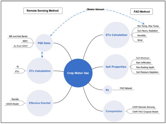 Previous studies [13,14,20,31] utilized either CROPWAT or the Remote Sensing approaches for CWR estimation. However, earlier studies did not discuss the link between the Remote Sensing-based CWR and the CROPWAT model-based CWR. The novelty of the present study was to use high-resolution PS data and compute the CWR based on the remote sensing method, comparing it with CROPWAT based CWR.