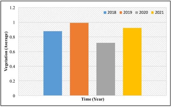 Vegetation area peaks were seen for 2019 and 2021 for December and January. The year 2020 had a lower annual mean vegetation area than the other three years, namely 2018, 2019, and 2021. Low vegetation is present from March 2019 to August 2020. The COVID-19 pandemic effect and reduced rainfall in 2019 were the fundamental causes of this low agricultural output. For better visualization, the NDVI images were divided into four categories: no vegetation from −1 to 0.15, low vegetation from 0.15 to 0.30, medium vegetation from 0.30 to 0.45, and high vegetation from 0.45 and above (Figure 7). The NDVI values in May 2020 were the highest of any month. For all three years of research, the NDVI of November, December, and January were more significant than other months. However, there was less vegetation in April, May, and September. The wheat cycle was shown to be highly linked with the NDVI data.