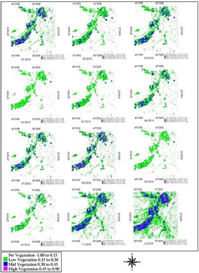 The largest vegetation area in the observation period was recorded in December 2018, and the lowest vegetation area was detected in April 2020 (Figure 5 and Figure 6).