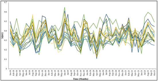 Monthly changes in NDVI for twenty crop fields in Al Majmaah from January 2018 to October 2021 (Each color line shows a specific field).