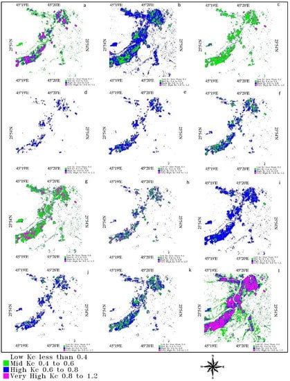 Monthly averaged Kc maps for Al Majmaah from January 2018 to December 2018 (left to right and top to bottom). The months are represented from (a–l) for January–December.