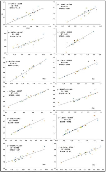 The monthly averaged Kc value curves for all crops and the monthly NDVI curves showed a similar pattern. Monthly linear regression models were developed to find the link between NDVI and averaged Kc for the selected 20 sites to quantify this relationship (Figure 10).